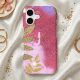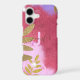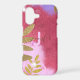 A modern chic iPhone case, tailor-made for those who adore a hint of opulence. A graceful shade of pink, adorned with a shimmering, sparkling texture, sets the stage for elegance. The left side boasts an enchanting arrangement of golden leaves, adding an extra layer of allure. Personalisation takes centre stage with your name, artfully scripted in cursive, alongside your initial letter presented in a sleek, modern sans-serif font. This case is not just an accessory; it's a reflection of your unique style.