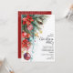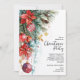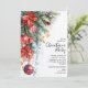 Elegant Christmas holiday party invitations feature poinsettias, pine branches, Christmas ball ornaments with your details in chic lettering, perfect for your festive business or friends and family holiday gathering.