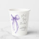 Elegant paper cups for your bridal shower featuring a beautiful watercolor of a purple coquette bow, "She's tying the knot" in a chic calligraphy script, and the bride's name and shower date in simple modern lettering.