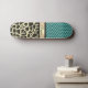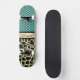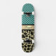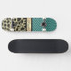 On this stylish skateboard is an elegant quatrefoil pattern on a turquoise backdrop along with a gold ribbon where you can customize it to make it uniquely your own then below that is an exotic giraffe design creating trendy chic vibes.
