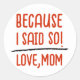 This vibrant sticker boasts a humourous yet authoritative message from the beloved mum: "Because I Said So!" The striking red typography against a white background exudes both maternal power and affection. With a minimalist chalk-like design, it offers a personalised touch with customisable text and signature options. Ideal for empowered mothers and grandmothers seeking a heartfelt expression of love and authority.