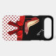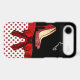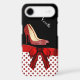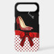 Chic iPhone 6 case done in black, on the top and a white with red glitter looking polka dot print, on the bottom. Graphics of a red satin ribbon and bow decorates the middle and a pair of red glitter looking stiletto heels are on the top half. Personalise the white text for yourself or as a great gift idea.