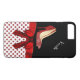Chic iPhone 7 Plus case done in black, on the top and a white with red glitter looking polka dot print, on the bottom. Graphics of a red satin ribbon and bow decorates the middle and a pair of red glitter looking stiletto heels are on the top half. Personalise the white text for yourself or as a great gift idea.