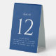 Sturdy and resilient to the elements, these royal blue tented table numbers feature elegant, custom, white text to not only show your guests where to sit but also share a little of your story through the descriptive text below the number.