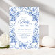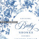 Create a timeless first impression with this baby shower invitation featuring elegant French toile de jouy roses in refined shades of navy blue, royal blue, dusty blue, and deep blue, inspired by classic chinoiserie floral design. This sophisticated style blends heritage elegance with modern charm, making it perfect for a memorable baby shower celebration.