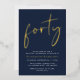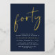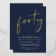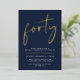 Elevate your 40th birthday party with this chic dark blue invitation featuring "forty" showcased in a stylish script and your name in elegant serif typography, all rendered in your choice of genuine gold, silver foil or rose gold foil, and the party details in simple, modern lettering.
