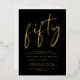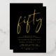 Chic black 50th birthday party invitation featuring "fifty" showcased in a stylish script, your name in elegant serif typography and the party details in simple, modern lettering, all rendered in your choice of genuine gold, silver foil or rose gold foil.
