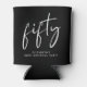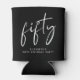 Fun black can coolers for your 50th birthday party featuring "fifty" showcased in a chic white script and your name in simple white lettering.