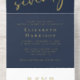 Elegant dark blue 70th birthday party all-in-one invitation that features "seventy" in a large chic script, your name in elegant serif typography, the party details in simple lettering, and a white tear-away RSVP response card, all rendered in your choice of genuine gold, silver or rose gold foil.