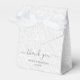 Elegant white on white filigree print pattern with your names and thank you in chic charcoal grey (or any colour) lettering on the front, these ribbon closure tent style party favour boxes are beautiful for wedding favours, bridal shower favours or any special occasion.