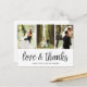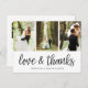 A modern photo thank you postcard designed to accommodate three of your favorite wedding photos aligned side by side. "Love and thanks" appears along the bottom in black handwritten style script. Personalize with your names and/or wedding date beneath.