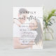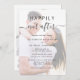 Modern all-in-one wedding invitation featuring your photo overlayed with your customised invitation and "Happily Ever After" written in a mix of simple typography and a chic script with swashes. On the reverse side, personalise your RSVP details in elegant typography and input your wedding website address to create a QR code for your guests to scan to RSVP online and to obtain additional wedding details such as accommodations and directions.