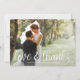 A modern wedding thank you card designed to accommodate your favourite full-bleed horizontal or landscape orientated wedding photos. "Love and thanks" appears at the bottom as a white text overlay in handwritten style script, with your names beneath. Add an optional message to the subtly patterned back using the field provided, or delete the sample text to add your own handwritten message of thanks.
