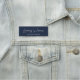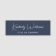 Professional and elegant dark blue name tag featuring your name showcased in a chic modern white signature script and your company or title in simple white lettering.