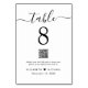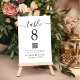 Chic white wedding reception table number sign with "table" in an elegant calligraphy script with swashes, the table number in classic gold serif typography, your first names joined by a heart and your reception date, and a QR code linked to your website for guests to scan to upload photos or for other reasons.