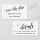 Keep your wedding guests in the loop with all your details with these thorough wedding favour inserts. These pretty cards reflect an elegant, casual style. Chic text overlays were designed using a modern script font in black. One side reads "save the date" and the other, simply says "details". Use the template fields to customise these enclosure cards with your personal information. Printed using "business card technology" the handy size will be easy to keep on hand. Mail them with your traditional mailings, and keep a few around to share with those who need an extra or two! The background is white and this editable colour can be changed to anything from your wedding palette that you choose; all editable text appears in black. // 99 // Designed by Melody Watson for Paper Muserie.