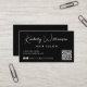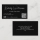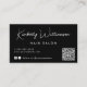 Chic black business card featuring your name or brand showcased in a modern white signature script and business type or title in clean white lettering. Input your website address to create a QR code that customers and clients can scan for a list of your products, services, hours, etc., and add your instagram and facebook user ids for customers to follow and connect with you on social media. You can add additional information on the back or leave it blank.