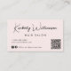 Chic light pink business card featuring your name or brand showcased in a stylish signature script and business type or title in clean modern lettering. Input your website address to create a QR code that customers and clients can scan for a list of your products, services, hours, etc., and add your instagram and facebook user ids for customers to follow and connect with you on social media. You can add additional information on the back or leave it blank.