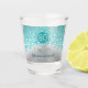 Chic personalised shot glasses with teal blue glitter and silver colours.