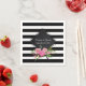 Custom wedding paper napkins done in a black and white striped pattern. A black decorative text area, in the middle of the napkin, is decorated with watercolor pink peonies, on the bottom. Personalise the text with the bride and groom's names and wedding date.