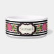 Chic white ceramic pet food / water bowl, with graphics of a black and white horizontal stripe pattern. Graphics of a band of pink roses, runs across the middle and a decorative text area, on the front, has black text ready to personalise, for your pet or as a great gift idea for any pet owner. Matching pet bed available.