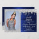This chic blue background with silver glitter sparkle drips theme sweet 16 invitation is great for young ladies ready to step into her spotlight and celebrate her birthday with family and friends. This invitation has a metallic blue ombre background with pretty silver glitter sparkle drips as a background. Customise the photo, name, dates, location, and RSVP information for the birthday girl.
