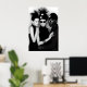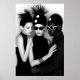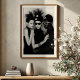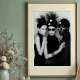 Immerse yourself in the striking harmony of this black and white art print, a captivating portrayal of avant-garde fashion and artistic unity. This powerful image features three meticulously styled figures, creating a compelling tableau of modern elegance. The central woman, with her mysterious dark sunglasses and unique black hat adorned with white dots and radiating spikes, exudes an air of cool sophistication. She is flanked by a woman with eyes closed in serene contemplation, showcasing a sleek hairstyle and minimalist black attire, and a man with distinct dark skin and iconic white round sunglasses, contributing to the ensemble's bold contrast. Their hands intertwine, suggesting a powerful connection and synergy within their shared stylistic vision. Rendered in high-contrast monochrome against a subtle grey backdrop, every intricate detail, from the sculptural headwear to the textured bracelet, is highlighted with graphic precision. Perfect for modern living spaces, fashion studios, or any decor seeking a touch of edgy elegance, unique style, and a powerful visual narrative.