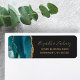 The left-hand edge of this elegant modern wedding invitation return address label features a teal blue watercolor agate border trimmed with faux gold glitter. The customisable text combines gold coloured handwriting and copperplate fonts on a dark charcoal grey background.