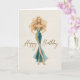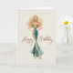 A stylish birthday card featuring a poised blonde in a teal and gold fitted gown, designed with clean lines and subtle shimmer. The minimal background and refined illustration make this a great choice for celebrating someone with modern style and quiet confidence.