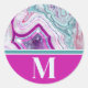 Chic Modern Teal Pink Agate Stone Initial Monogram Classic Round Sticker. Crystals and geodes continue to be a favourite trend! This print features and up close image of a vibrant turquoise and purple or magenta pink geode stone, complete with little crystals. Add your initial to make it your own.