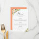 Chic typography, peach watercolor floral arrangements, wedding menu card with hand drawn script and decorative accents. Back of card, shown in trendy cantaloupe, can be customised.