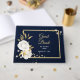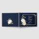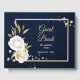 beautiful elegant white flowers with some gold leaves chic navy blue guest book.