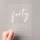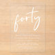 Elevate your 40th birthday party with this chic clear acrylic invitation featuring "forty" in a stylish white script, your name in elegant white serif typography and the party details in simple, modern lettering,