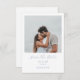 This beautiful oh so chic and minimal, white wedding 'Save The Date' card showcases your couple photo, elegant brush script text, event date and address, along with a contemporary set of fonts in dusty blue. The back includes additional optional text. Leave this text box empty if no text is required here. Youthful and trendy, this card sets a joyful tone. Use Edit tool to change the background colour if you prefer.