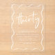 Clear acrylic invitation for your 30th birthday party featuring a trendy white wavy frame, "thirty" in a chic large white script, your name in elegant white serif typography and the party details in simple, modern lettering,