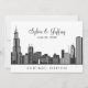 Elegant and stylish wedding invitations feature a vintage art deco style city skyline silhouette of downtown Chicago, Illinois. Black and white colour scheme.