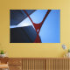 Take home a Chicago icon! Looking up from below, sleek modern Chicago skyscrapers are framed by a bold, red steel abstract structure against a clear blue sky. The contrasting elements create a striking, upward perspective.