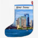 A vibrant Chicago cityscape features a variety of modern skyscrapers and high-rise buildings against a clear blue sky. The foreground is dominated by a calm body of water where boats can be seen.