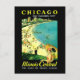 Vintage poster art for Chicago Illinois Central with an art deco woman looking out on Lake Michigan.