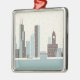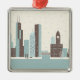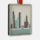 A retro-styled winter scene of the Chicago skyline with a couple and dog walking along the water.