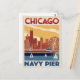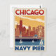 Celebrate the dynamism of the "Windy City" with this vibrant retro travel postcard featuring the Chicago skyline. The design highlights the iconic buildings and the Navy Pier Ferris wheel set against a warm, orange sky. With sailboats cruising on Lake Michigan, this artwork captures the energy and architectural appeal of this major US city in a striking, vintage poster style.