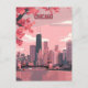 A beautifully illustrated travel postcard capturing the iconic Chicago skyline in a dreamy springtime setting. Framed by cherry blossoms, the scene showcases skyscrapers reflecting in the calm waters of the Chicago River. Soft pastel tones, birds in flight, and a warm sunset ambiance enhance the charm of this vibrant cityscape, making it an ideal representation of Chicago’s urban beauty and seasonal elegance.