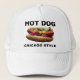 A Chicago Style Hot Dog has mustard, relish, onions, sport peppers, pickle slice, fresh tomatoes, celery salt on a steamed poppy seed bun.
