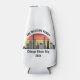 Personalized Chicago Illinois vacation bottle cooler with a silhouette of the city skyline in front of a cool sunset. Cool trip keepsake souvenir for a family trip.