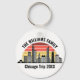Personalized Chicago Illinois vacation keychain with a silhouette of the city skyline in front of a cool sunset. Cool trip keepsake souvenir for a family trip.