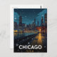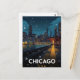 Experience the dramatic beauty of Chicago, USA, with this captivating vintage-style postcard featuring the city skyline at night in winter. The design captures the glittering downtown buildings, including the iconic towers, reflecting in the water, viewed from a snowy, illuminated train platform. This travel poster is perfect for lovers of US cities, urban nightscapes, and dramatic winter scenes. Ideal for sending greetings, keeping as a keepsake, or framing as sophisticated wall art.