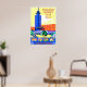 A carefully restored ad poster for the 1933 Chicago Worlds Fair Celebrating A Century of Progress. A stylised art deco rendition. Very colourful with brown, orange, yellow with a tall central building in blue and green trees in the foreground.
