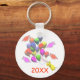 Keychain for a children's kindergarten or preschool graduation with my artwork of a cute little chicken holding a bunch of colourful balloons with graduation caps.