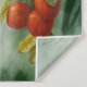 Birds in the apple orchard during the autumn harvest. Two black-capped chickadees perch in an apple tree while a third chickadee sits on a basket filled with ripe, freshly harvested fruit ready for market. Realistic artwork created from an original oil painting by wildlife artist Crista S. Forest.