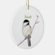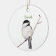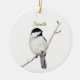 A color pencil drawing of a little Chickadee adorns this customizable ornament! Personalize by changing the text as you wish!